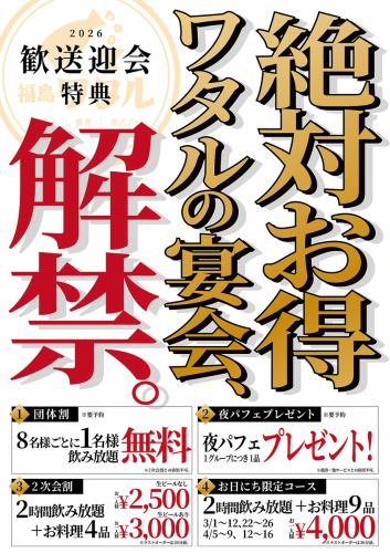 【絶対お得なワタルの歓送迎会:情報解禁】団体割、2次会割り、お日にち限定コースなど盛りだくさん。詳細はコースページやクーポンページをチェック